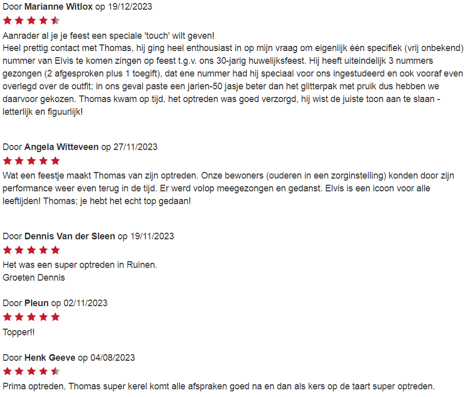 De muziek wordt verzorgd middels professionele ‘backing tracks’. Nummers waarbij de stem van Elvis is weggelaten. Ik zing dus live. Ik heb een eigen geluidsinstallatie maar kan in overleg met bijvoorbeeld een DJ of een andere zanger ook gebruik maken van iemand anders zijn installatie. Ik zet mijn installatie zelf neer wat ongeveer 25 minuten in beslag neemt. Vervolgens kleed ik me om en zal ik mijn opwachting gaan maken. Vaak wordt ik geboekt als verrassing voor iemand, hou er rekening mee dat ik dan een ruimte nodig heb om me om te kunnen kleden.